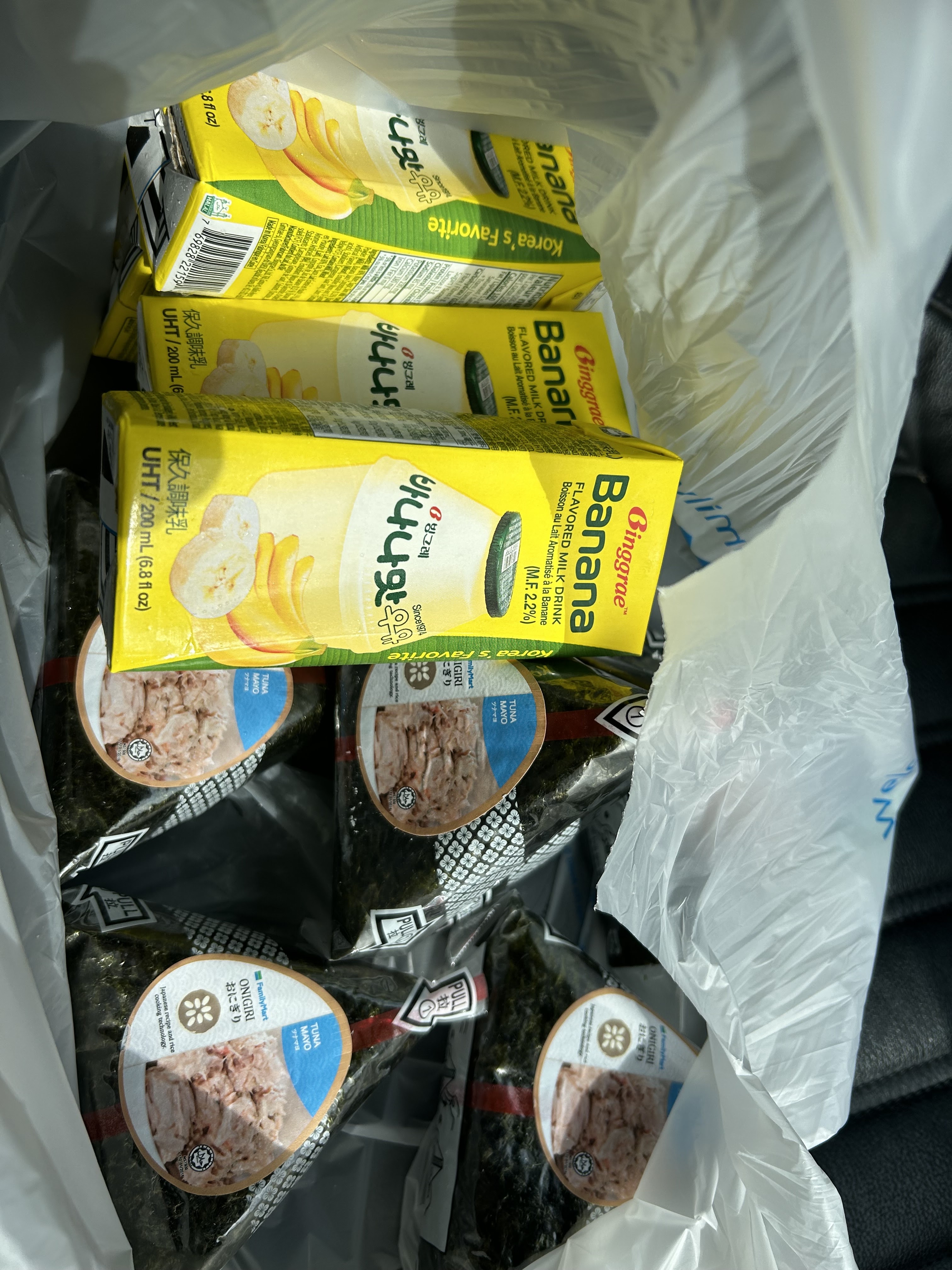 Dania dan kawan-kawan makan sebanyak 2 round Bibimbap sebab ada 8 kimbap ni (2 orang bawa 1 setiap seorang, Dania bawa 4 dan lagi seorang bawa 2). Setiap seorang juga dapat susu pisang atau Banana Uyu. Ada beli kat CU dan ada yang beli kat FamilyMart. Kenyang Dania kata. Paper plate dengan sudu pun lecturer yang bawa bersama bekas besi ni. Boleh la save duit makan untuk dinner nanti untuk 3 kawan Dania tu. Rezeki group Dania dapat makan 2 round sampai kenyang.